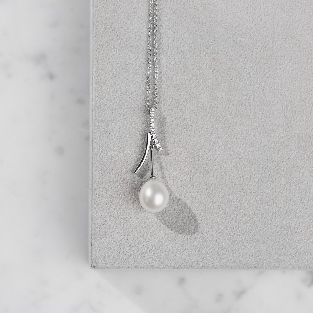 Glamur koji ostavlja bez daha! Ogrlica od belog zlata sa prirodnim biserom 0.90gr i dijamantima 0.05ct VS/G. Preporuka za dame koje neguju besprekoran stil.