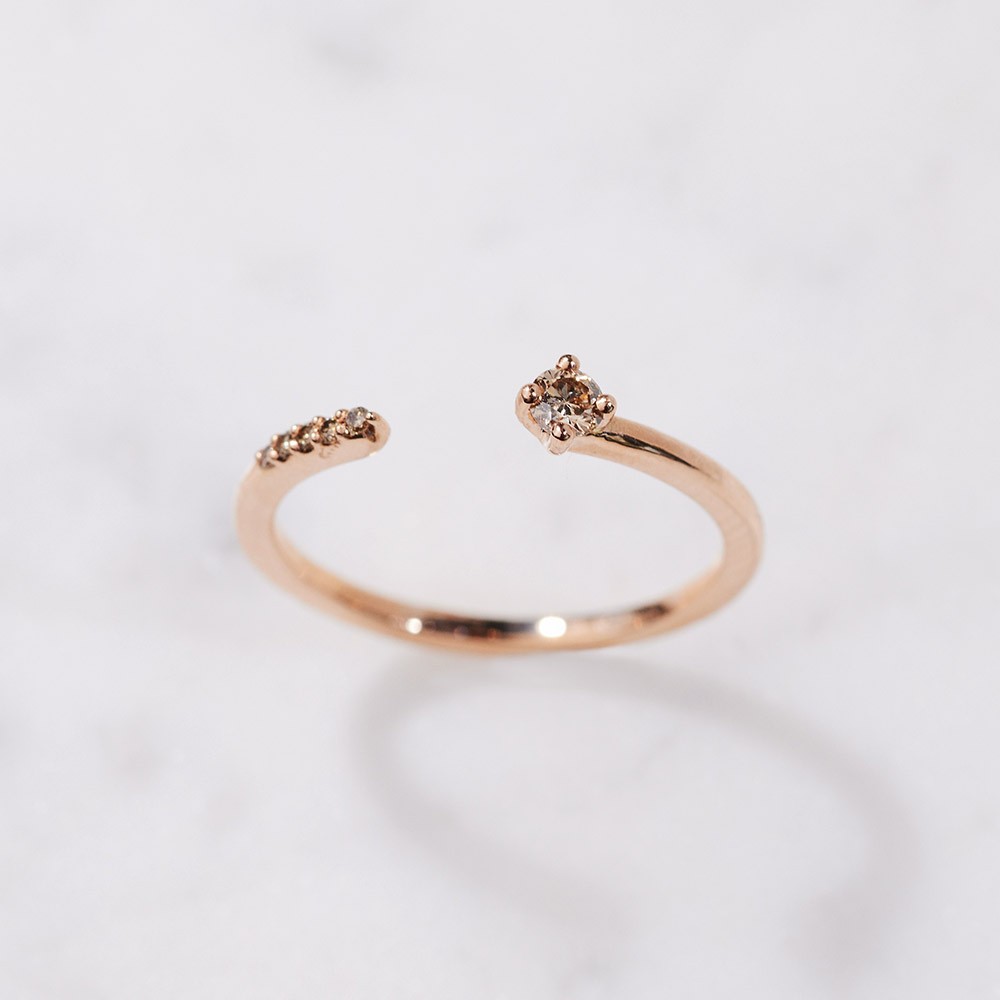 Novi nivo sofisticiranosti, ogleda se u duhu slobodne forme koja pomera granice beskonačnog. Koncept otvorenog prstena je izbor dama koje su spremne da razbiju stereotipe, u isti mah, otvarajući novu dimenziju nežnosti. Izrađujemo ih po Vašoj meri, u sve tri boje zlata. Karataža braon dijamanta je 0.13ct.