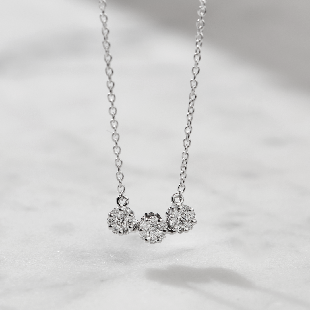 Skup blistavih dijamanata 0.16ct VS/G u delikatnim držačima od belog zlata. Ova prefinjena ogrlica oslikava moć i nežnost jedne žene.