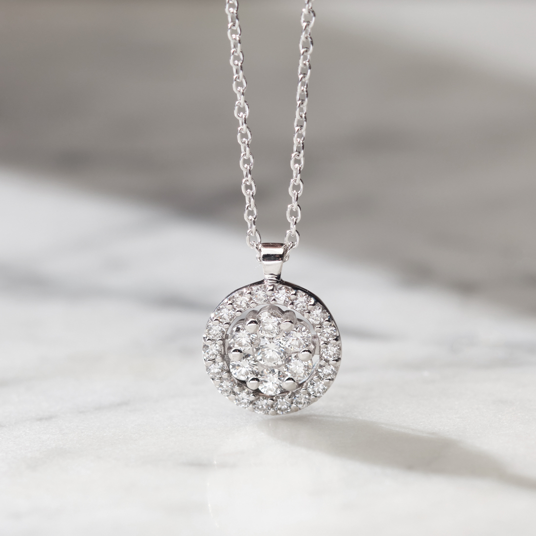 Privezak obasut dijamantima 0.41ct VS/G, na delikatnoj ogrlici od belog zlata. Svedena forma u najluksuznijim materijalima govoriće o besprekornom stilu osobe koja je nosi. Ovu predivnu ogrlicu možete nositi sa minđušama i prstenom iz istog seta.