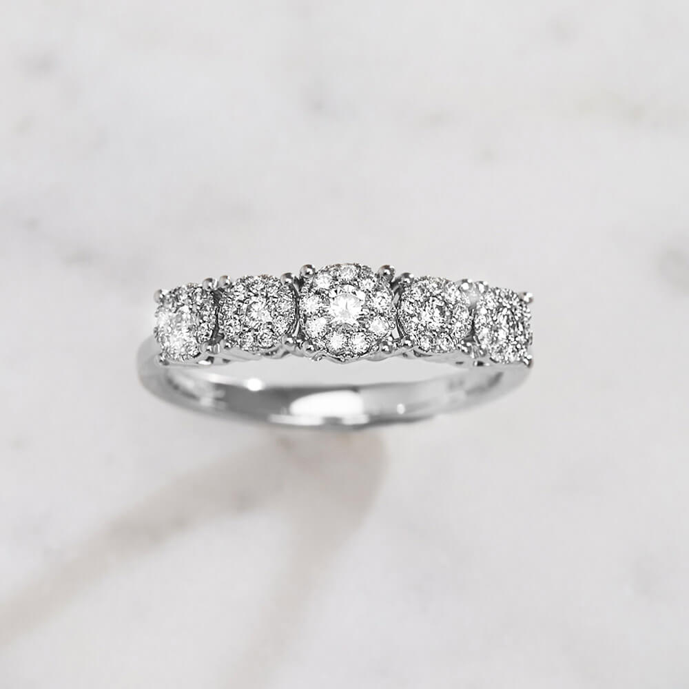 Glamur i raskoš u jednom vereničkom prstenu! Izradjen od 18kt belog zlata. Model koji je ukrašen mnoštvom dijamanata 0.39ct SI/H, ugrađenih specijalnom tehnikom invisible setting, kod koje više manjih dijamanata odaju utisak jednog većeg. Dijamantska rapsodija, najnovije iz Personala!