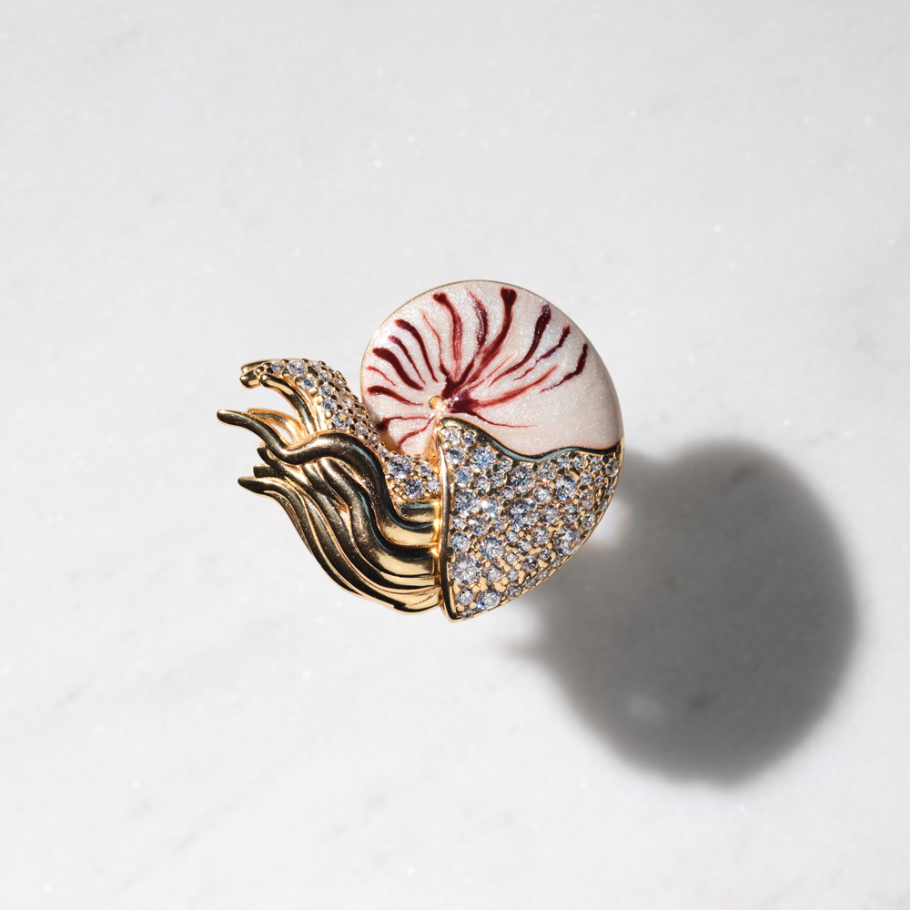 Lepota mora sačuvana u modernim i ekstravagantnom prstenu. Prsten je izrađen od srebra sa pozlatom, cirkona i ručno je oslikan sedefnim emajlom.