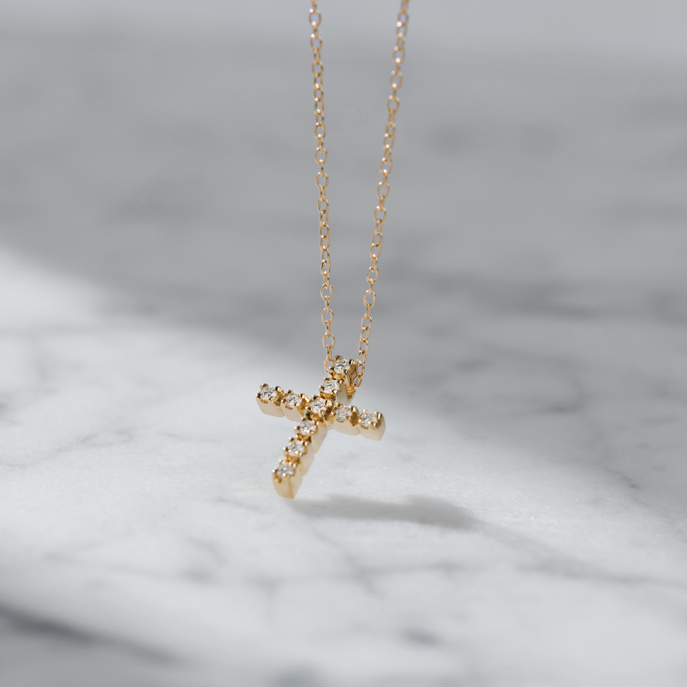 Minimalistički simbol sa snažnom porukom. Krstić od žutog zlata diskretno je ukrašen nizom sitnih dijamanata koji nežno hvataju svetlost pri svakom pokretu. Savršen balans duhovnosti i savremenog dizajna.