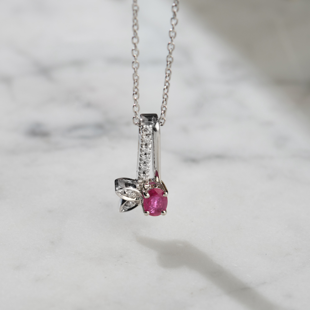 Neprolazni motivi cveća zapečanjeni u luksuznom komadiću nakita. Ogrlica je izrađena od belog zlata, dijamanata 0.04ct VS/G i prirodnog rubina 0.23ct, i možete je kombinovati sa ogrlicom iz iste kolekcije.