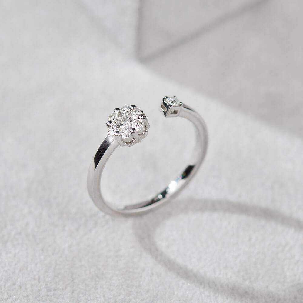 Moderan i artistički prsten. Namenjen za veridbu, ali i kao modni detalj. Ovaj prsten pleni unikatnim dizajnom i veoma retkom ugradnjom kamenja. U pitanju je invisible setting, tehnika kod koje više manjih dijamanata 0.27ct SI/G daju iluziju jednog većeg, a prelamanje svetlosti je magično. Ukras za sve moderne princeze.