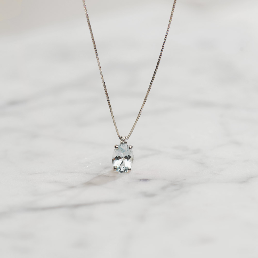 Decentna ogrlica od 18kt belog zlata, ukrašena akvamarinom 0.73ct i dijamantom 0.01ct VS/G. Akvamarin je čuven po svojoj retko plavoj boji. Belo zlato i akvamarin su nepogrešiva kombinacija za dame koje prate trendove. U zlatari Personal dostupne su i minđuše istog dizajna.