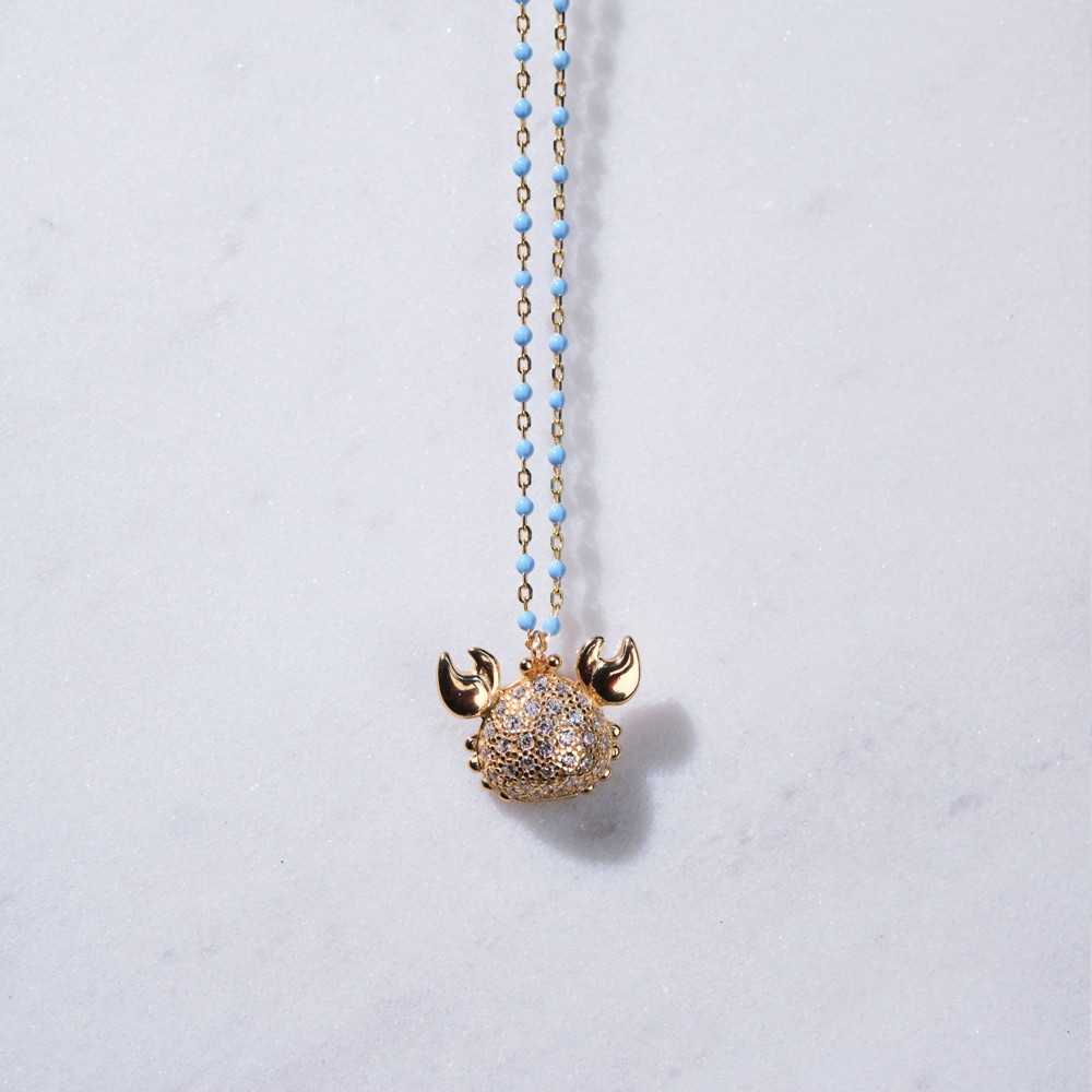Kraba je simbol koji se vezuje za srećan i harmoničan život. Ogrlica sa detaljem je izrađena od pozlaćenog srebra, azurnog emajla i cirkona. Obradujte sebe ili dragu osobu ovim šarmantim nakitom.