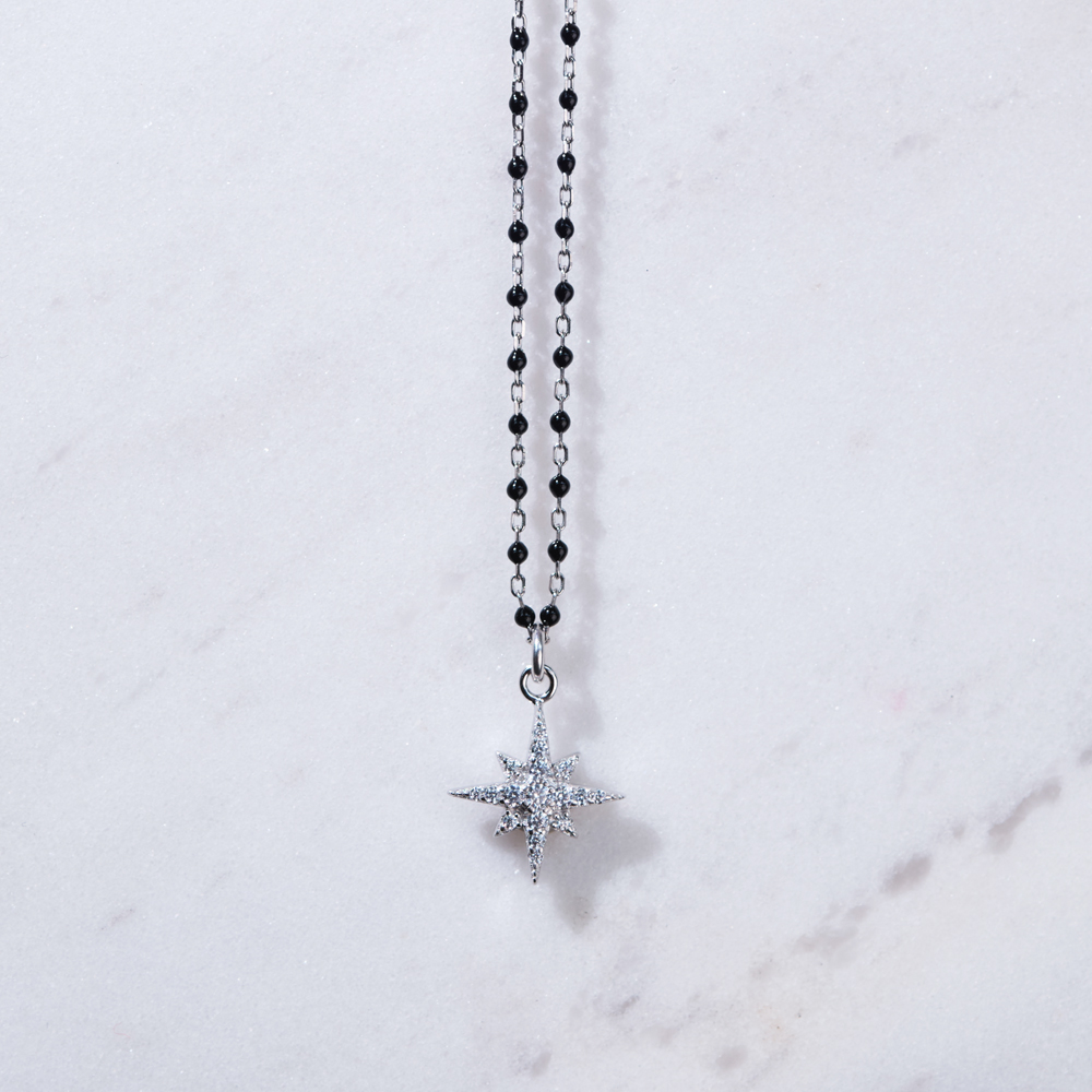 Ogrlica sa nanizanim oniksima i detaljem zvezdice, izrađene od srebra i oplemenjene cirkonima. Idealan poklon za osobu kojoj želite da pošaljete poruku da verujete u nju!