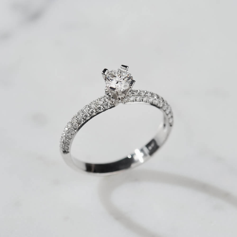 Izuzetno elegantan i atraktivan verenički prsten, izrađen od belog zlata. Lak za kombinovanje sa ostalim komadima nakita ili sa burmom. Pored klasike koja ga odlikuje, ovaj model poseduje i blistav odsjaj brilijanata 0.67ct VS/GH, koji ovom modelu daju pomalo bajkovitu notu. Preporuka za sve dame koje žele prefinjenu klasiku u svom vereničkom prstenu.