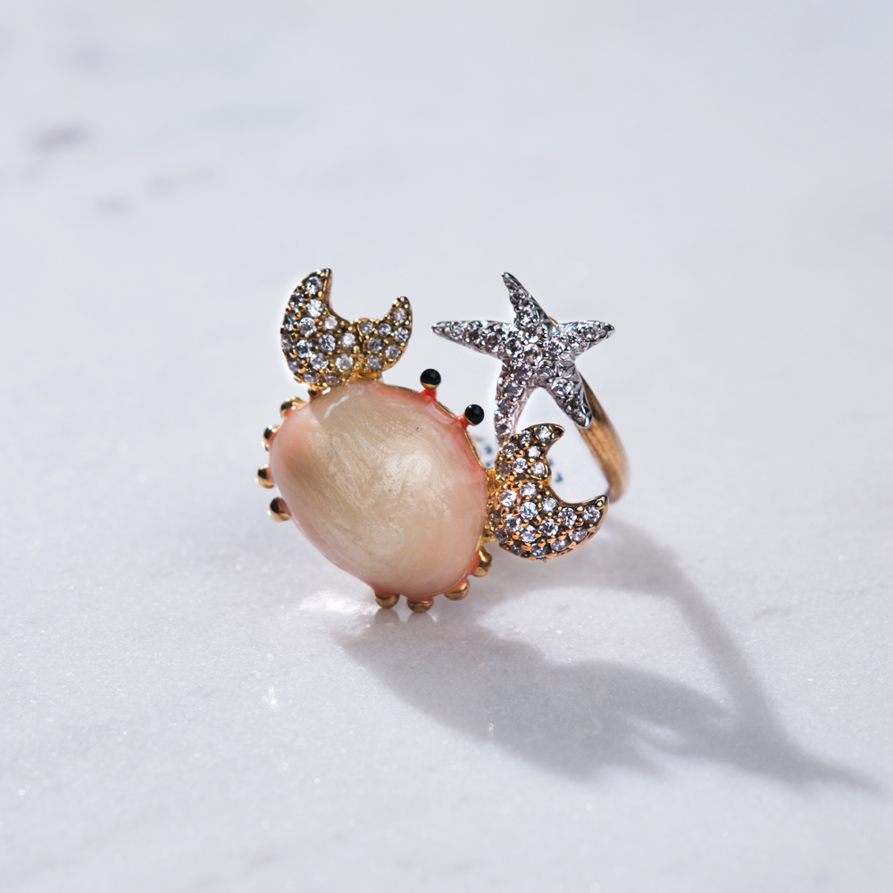Mali praznik za vaše ruke ovog leta! Prsten sa motivom krabe, izrađen je od pozlaćenog srebra, cirkona i sedef roze emajla.