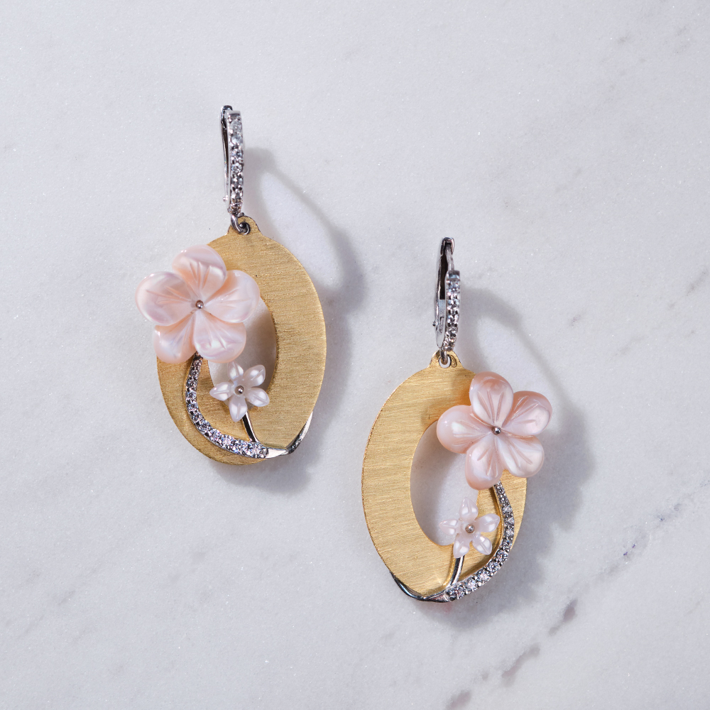 Viseće srebrne minđuše sa 18-karatnom pozlatom i cirkonima. Cvetni motivi izrađeni su od roze sedefa.