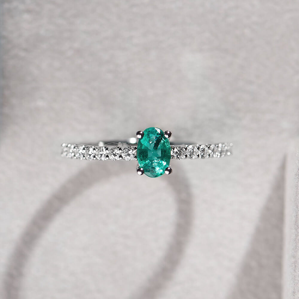 Atraktivan, a istovremeno elegantan model vereničkog prstena. Izradjen od belog zlata, dok centralni deo čini ovalno brušen smaragd 0.50ct. Sa obe strane je optočen brilijantima 0.28ct VS/G. Zajedno čine blistavu rapsodiju. Ovaj model vereničkog prstena, prilagodjen je potrebama modernih dama i pogodan je za svakodnevno nošenje. Preporuka za sve dame koje su nežne i elegantne.