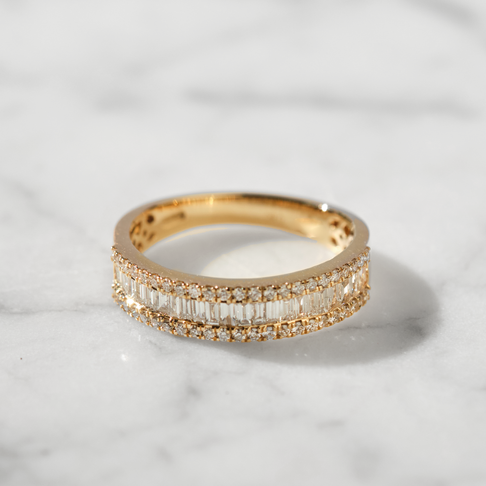 Prsten od žutog zlata sa dvostrukim nizom dijamanata donosi intenzivan, ali rafiniran sjaj. Geometrijska preciznost i ravnomerno postavljeni dijamanti stvaraju efekat kontinuiteta — luksuz koji se vidi, ali nikada ne deluje nametljivo.